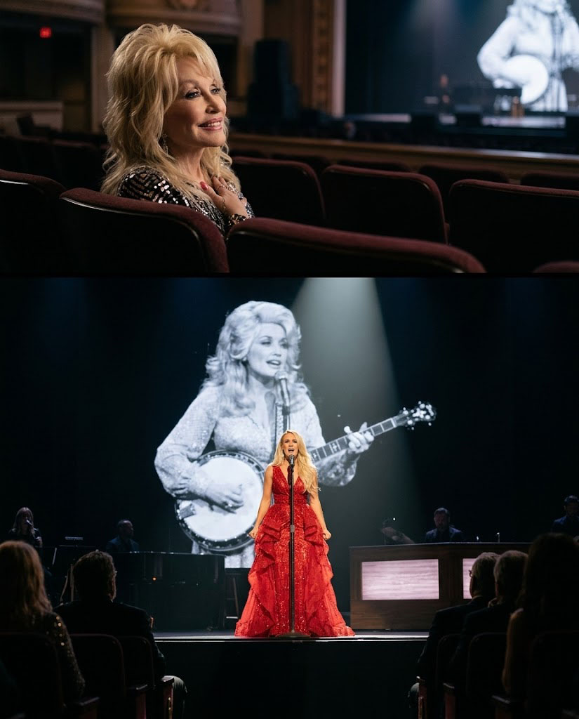 DOLLY PARTON EXPECTED A POLITE TRIBUTE. BUT THE MOMENT CARRIE UNDERWOOD STEPPED OUT OF THE SHADOWS, THE LEGEND REALIZED SHE HAD MET HER MATCH… The Grand Ole Opry was hushed, the scent of old wood and history hanging heavy in the air. Dolly Parton sat in the front row, a gentle smile on her face, expecting a polite rendition of the song that built her empire. She had heard “Jolene” ten thousand times—a soft, desperate prayer for mercy. But as the stage plunged into a sudden, midnight black, the gentle expectation shattered. Out of the shadows stepped a silhouette in a dress as red as a warning sign. Carrie Underwood didn’t start with a whisper; she unleashed the lyrics like a thunderclap. Her voice climbed to a fierce, haunting height that redefined the melody, turning a plea into a demand. Dolly’s breath caught. She leaned forward, watching as her own song was reclaimed with a raw, terrifying power. As the final note trembled into the deafening silence, Carrie locked eyes with the legend and did something no one in the Opry saw coming…