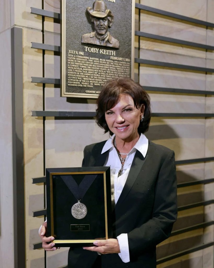 In the hallowed halls where country music’s giants are immortalized, the loudest sound wasn’t a guitar strum or thunderous applause—it was the quiet, trembling strength of a woman standing alone in the spotlight. When Tricia Lucus stepped forward to accept the medallion for her late husband, Toby Keith, the glitz of the Country Music Hall of Fame ceremony melted away. What remained was only the raw ache of absence and the enduring warmth of a love that spanned nearly forty years.